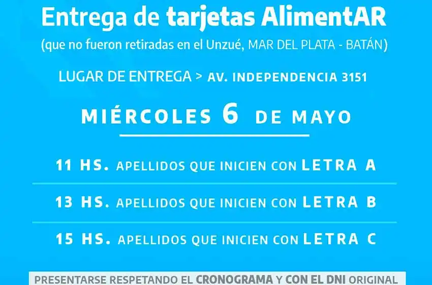 A partir de este miércoles comenzará la entrega de las Tarjetas AlimenAR que no pudieron ser otorgadas en Mar del Plata como consecuencia de la cuarentena causada por el COVID 19. El operativo se llevará adelante desde el miércoles 6 hasta el domingo 10 en la sede de ANSES ubicada en Av. Independencia 3154 . Se establecerá un cronograma de retiro de acuerdo a la letra de inicio de los apellidos de las titulares .