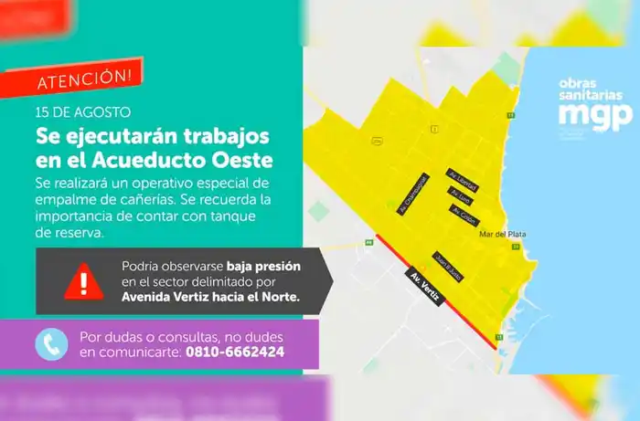 Un primer enlace de cañerías, que sentará las bases para lo que será el empalme principal de los sistemas Acueducto Oeste y Norte de Mar del Plata, tendrá lugar este sábado 15 de agosto en un sector del barrio El Casal (Autovía 2).