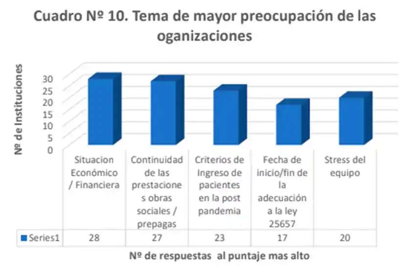 En cuanto a las preocupaciones que manifiestan las organizaciones respecto del futuro inmediato, la situación económica/financiera es una preocupación alta para el 70%, junto a incertidumbre sobre la continuidad de las prestaciones de obras sociales y organismos del estado (67,5 %).