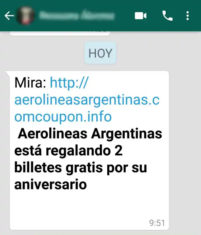 "Aerolineas Argentinas está regalando 2 billetes gratis por su aniversario", dice el mensaje, seguido de un link a una web.