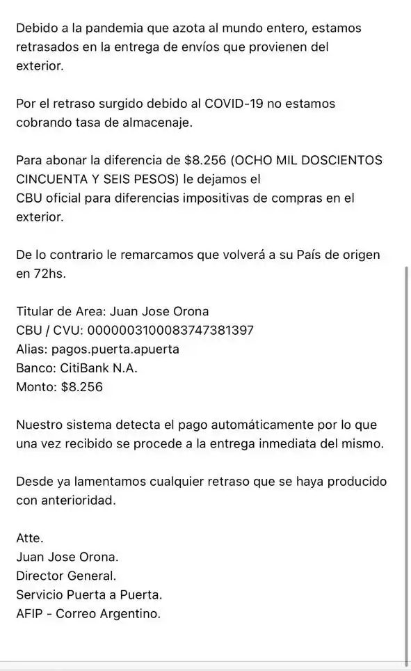 El director nacional del Correo Oficial de la República Argentina SA, Rodolfo “Manino” Iriart, indicó que desde la empresa se confirmó la falsedad de un mensaje en el que se informa a clientes que han recibido un paquete del exterior, pero como se observó una “diferencia en el valor declarado” se debía abonar un saldo de $8.256 para poder retirarlo.
