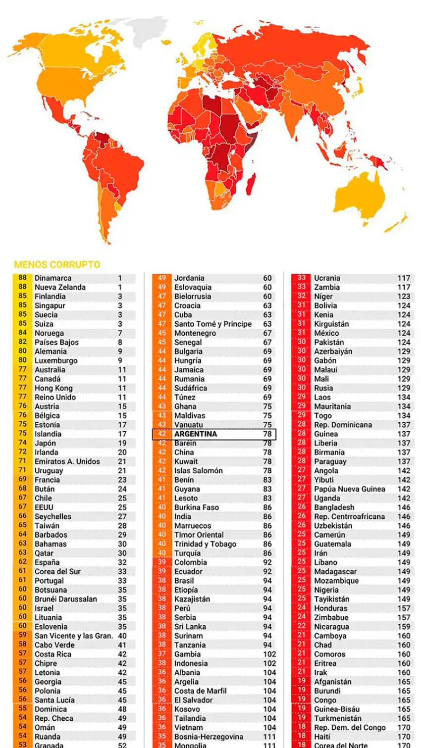 La peor perfomance del país había sido en 2015, cuando obtuvo solo 32 puntos sobre 100, y quedó en el puesto 107 sobre 168 países, mucho más cerca del final de la tabla que hoy.