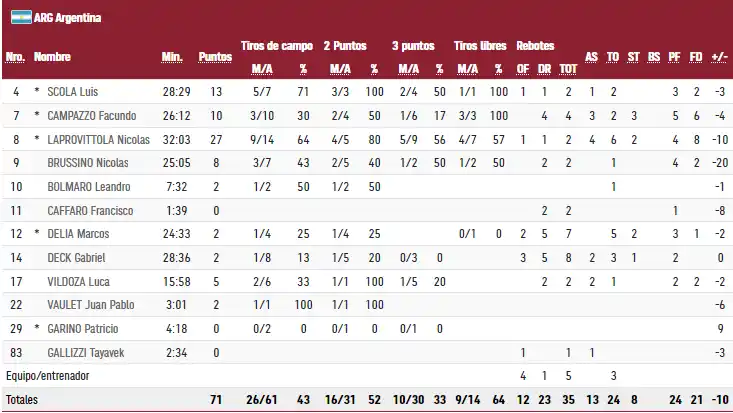 En cuanto a las actuaciones, Laprovittola terminó con 27 puntos (5 de 9 en triples), mientras que Luis Scola con 13 y Campazzo con 10 (se retiró por cinco faltas) lo acompañaron como líderes ofensivos. Luca Vildoza, por su parte, estuvo en cancha 15:58 minutos donde pudo aportar 5 puntos, 2 rebotes y 2 asistencias.