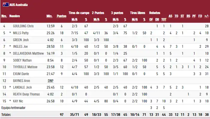 El equipo nacional tuvo un muy buen inicio de partido, pero no lo pudo sostener ante un sólido Australia. Los oceánicos se terminaron imponiendo por 97 a 59 para dejar eliminada a Argentina en los cuartos de final. El marplatense Luca Vildoza estuvo en cancha con 5 puntos. Fue la despedida de Luis Scola con un emotivo aplauso de toda la cancha.