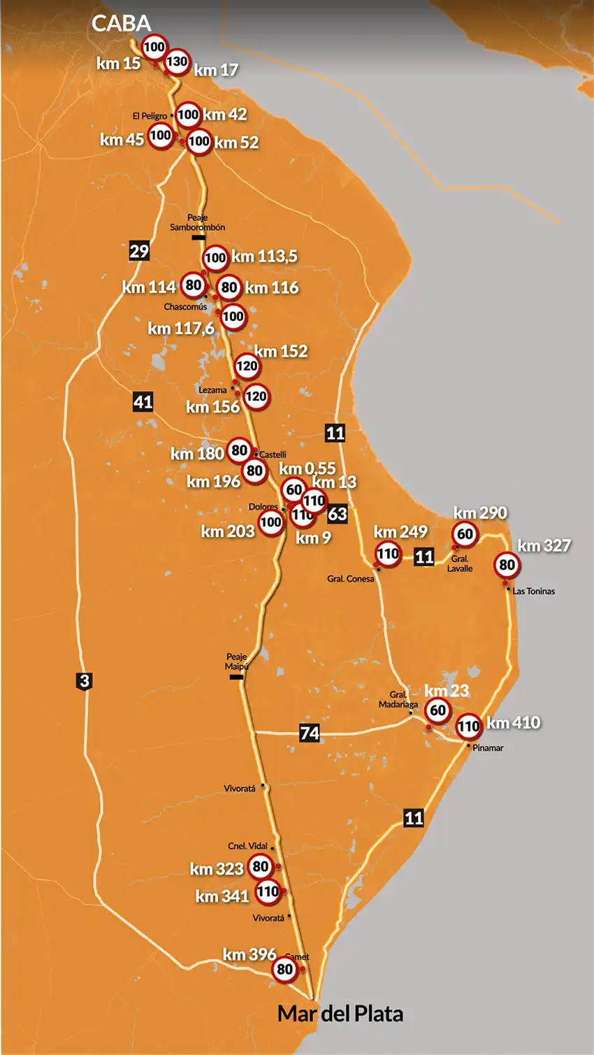 Los 54 radares están distribuidos en 20 puntos estratégicos, instalados en uno o ambos sentidos de la ruta y en uno o más puestos de control. Controlan que los conductores circulen a velocidades superiores a 60 km/h e inferiores a 130 km/h, según su ubicación. En la ruta que une la Capital Federal con Mar del Plata, es necesario atravesar 17 equipos de medición. Para llegar a Pinamar desde el mismo destino, hay que superar 18 puestos. Y para ingresar al Partido de La Costa, son 19 los radares que evaluarán los excesos de velocidad de los turistas.