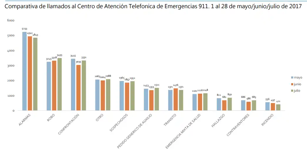 La comparativa de los motivos que originaron los llamados al 911 entre mayo y julio de 2017 muestra consistencia en los porcentajes. Las principales categorías se mantienen en los tres meses en los mismos lugares de importancia con diferencias porcentuales poco significativas.
