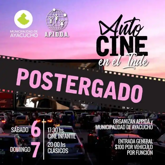 La Dirección de Cultura de la Municipalidad de Ayacucho, en conjunto con la Asociación Pro Integración del Discapacitado, había anunciado días atrás que el próximo fin de semana iba a tener desarrollo una doble función diaria de autocine en el club Independiente, sin embargo, no se llevará a cabo.