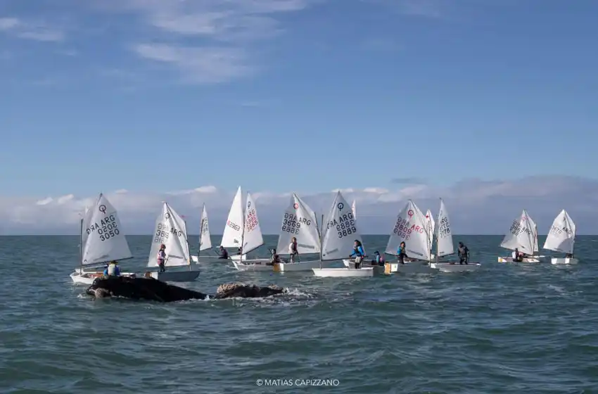 En las últimas horas, nautas de optimist entraron al agua para aprovechar la oportunidad y retomar sus entrenamientos, pero no esperaban una compañía tan especial: tres ballenas francas australes se sumaron a la práctica.