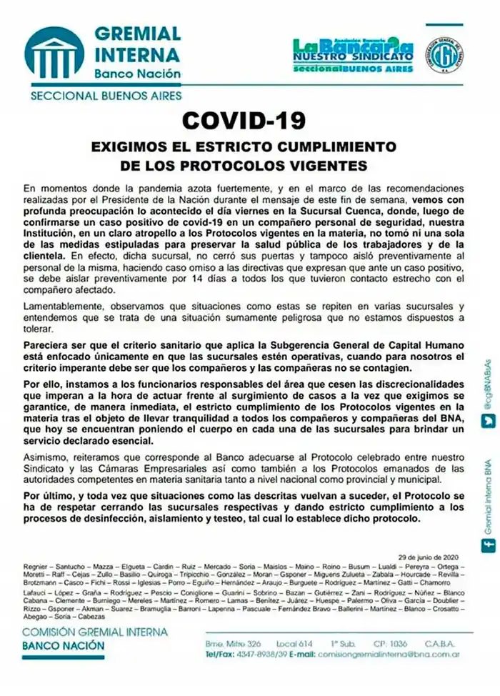 Además, afirmaron: "Dicha sucursal no cerró sus puertas y tampoco aisló preventivamente al personal de la misma, haciendo caso omiso a las directivas que expresan que ante un caso positivo se debe aislar preventivamente por 14 días a todos los que tuvieron contacto estrecho con el afectado".