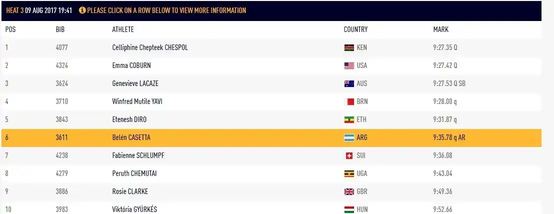 Esta marca le valió la sexta posición a la representante argentina. En tanto, el primer puesto de la competencia lo obtuvo la keniata Celliphine Chespol, con 9.27s35, el segundo fue para la estadounidense Emma Coburn, con 9n27s42 y el tercero para la australiana de Genevieve Lacaze, 9m27s53.