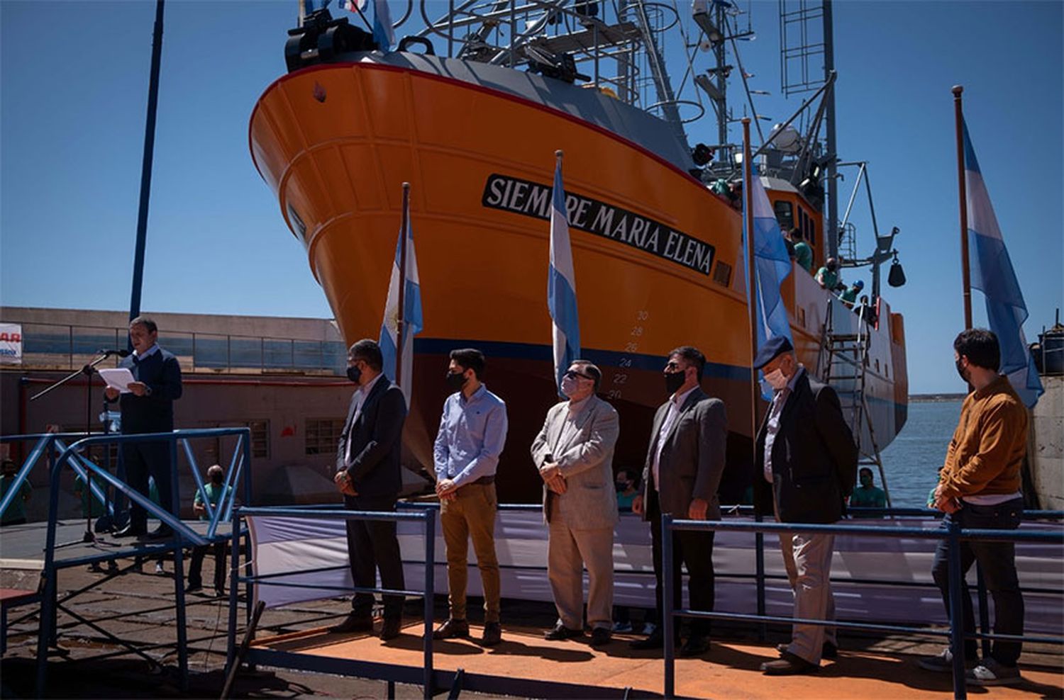 El buque pesquero "Siempre María Elena", construido durante la pandemia de coronavirus, fue botado este sábado en el puerto de Mar del Plata mediante una transmisión virtual que realizó la empresa armadora Contessi.