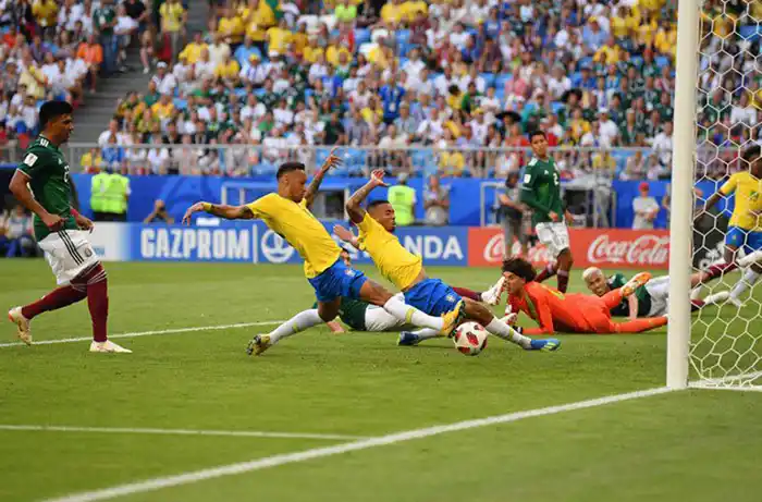 Con el paso del tiempo Brasil se fue asentando más en el campo y los mexicanos dejaron de presionar en cancha rival para hacerlo en la propia. Así la "verdeamarela" se fue haciendo dueña del encuentro y a los 50 minutos a través del ídolo Neymar, convirtió el primer tanto. Willian, desbordó por la izquierda del área y metió el centro raso al medio. Con Ochoa vencido, el astro del PSG marcó el segundo en su cuenta personal.