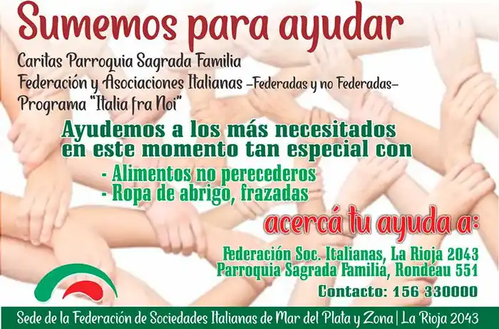 Es por eso, que la Federación de Sociedades Italianas Mar del Plata y zona realiza una colecta de alimentos no perecederos y ropa de abrigo para ayudar a aquellos que lo necesitan.