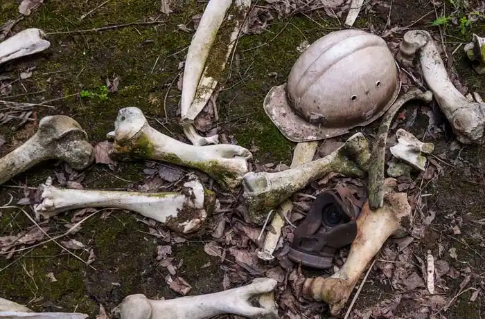 Huesos de animales se entremezclan con un casco de obrero. El desastre de Chernobyl fue como una gigantesca bomba sucia que esparció una gran cantidad de radiación.