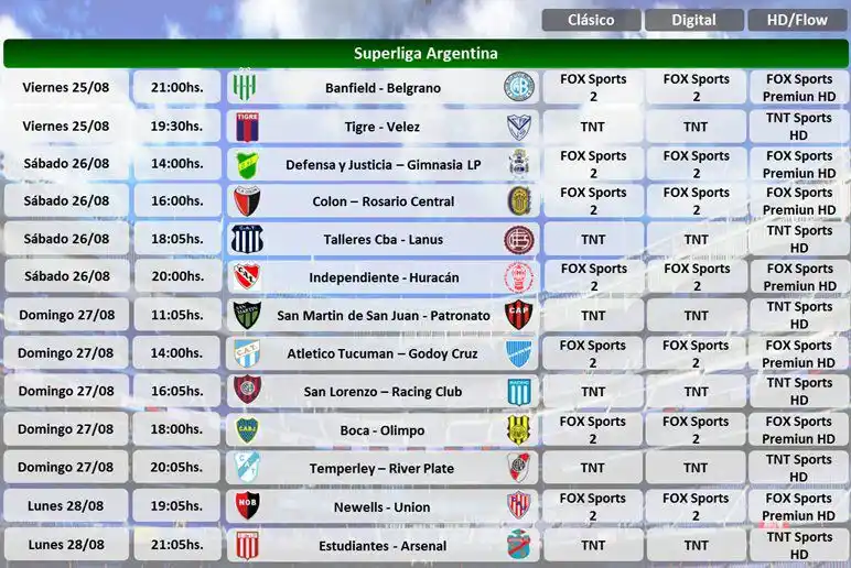 La Superliga Argentina de Fútbol podrá disfrutarse de manera gratuita en formato SD por los canales Fox Sports 2 (26) y TNT (47) hasta finales de septiembre o principios de octubre. Después de esa fecha, se deberá empezar a pagar 300 pesos extra, que te habilitan los canales Fox Sports y TNT Sports.