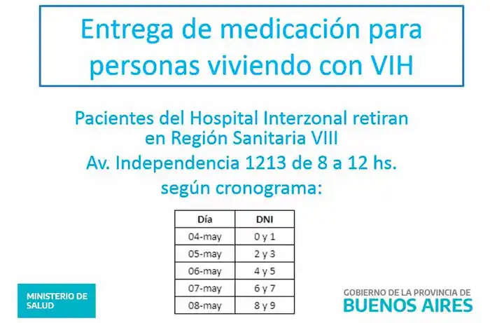 A partir de este lunes, las personas viviendo con VIH que eran atendidas en el Hospital Interzonal podrán retirar la medicación para los próximos tres meses, según el cronograma dispuesto, en la oficina del Programa en Región Sanitaria VIII (Independencia 1213) de 8 a 12.