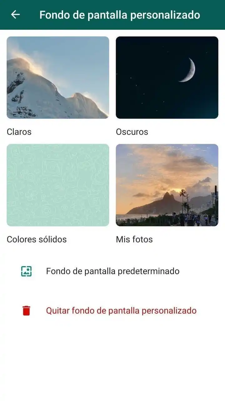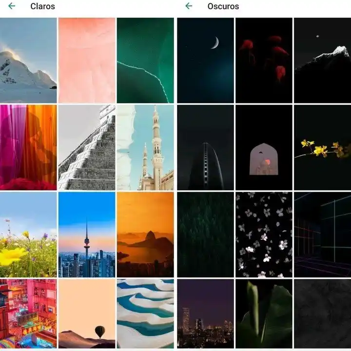En este apartado se encuentran cuatro "carpetas": Claros, Oscuros, Colores sólidos y Mis fotos. En estas opciones, el usuario encontrará una amplia variedad de imágenes, mientras que en la última, las imágenes logradas con la cámara del dispositivo. Para seleccionar una imagen o fotografía como fondo, solo hay que elegir que pulsar sobre la favorita.