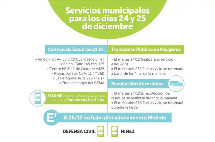 Por su parte el estacionamiento medido no funcionará el miércoles 25. Estarán disponibles los números de Defensa Civil (103) y Niñez (102)