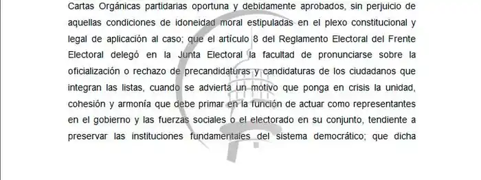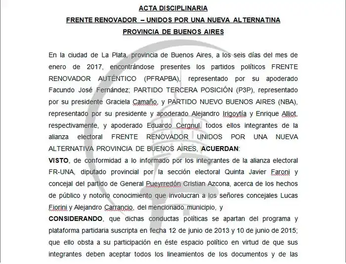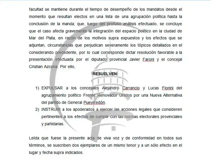 Dentro de los argumentos de la resolución, se destaca que este caso “afecta gravemente la integración del espacio político en la ciudad de Mar del Plata, en razón de los motivos supra expuestos y los efectos que se adjuntan circunstancias que perjudican severamente los tópicos detallados en el considerado precedente por lo cual corresponde dictar resolución favorable a la presentación efectuada por el diputado provincial Javier Faroni y el concejal Cristian Azcona”.