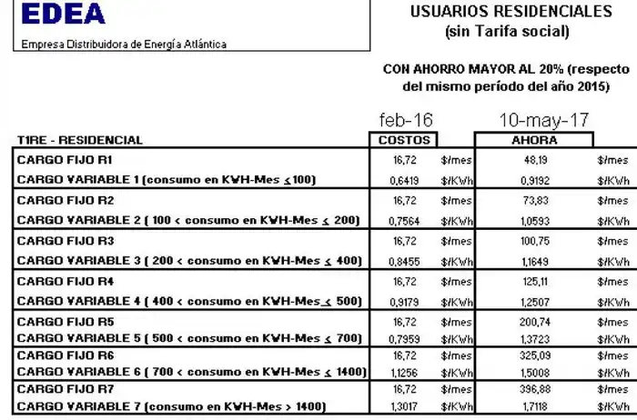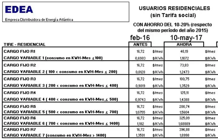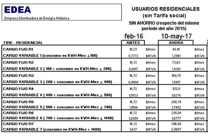 Desde la comuna explicaron que el cuadro relativo a los usuarios residenciales sin tarifa social, para la empresa distribuidora EDEA, regirá hasta el 30 de noviembre, fecha en la cual entrará en vigencia un segundo esquema con nuevos valores actualizados a ese período.
