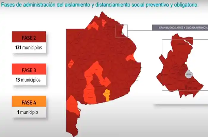 E informó que 121 distritos permanecen en Fase 2, tres en Fase 3 y uno en Fase 4. En este sentido, confirmó que Mar del Plata retrocederá a fase 2 a partir del lunes, una vez que termine el confinamiento estricto, por lo que se mantendrán muchas de las restricciones que hubo en estos 9 días, como la suspensión de clases presenciales.