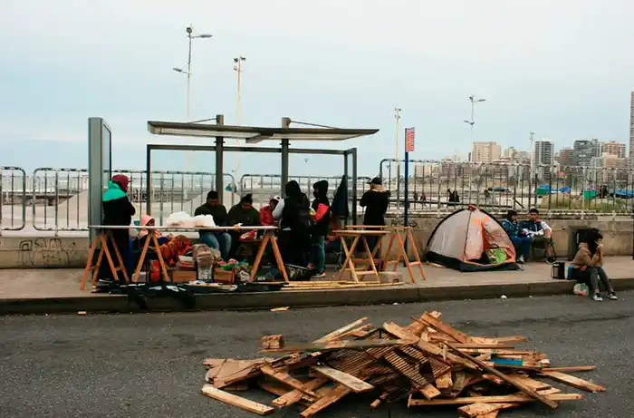Militantes del Frente Piquetero de Lucha realizan este viernes un acampe sobre el boulevard marítimo, en pleno centro de Mar del Plata, en reclamo de "canastas navideñas y puestos de trabajo genuino".