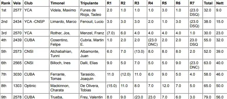 Afuera del puerto, los 29er, 420 y F18, categorías que corrieron tres regatas cada una, no tuvieron que enfrentar solo el fuerte viento, sino también a un ola arbolada que significó un gran desafío para todos los competidores. Hubo una particularidad en los Skiff y fue que en la última prueba del día, tres tripulaciones, justamente las tres que finalizaron en el podio, confundieron la boya del barlovento y fueron descalificadas, error que fue capitalizado por Jose Rother y Santiago Palkin. La dupla del YCA-CNMP, se adjudicó ese regata y escaló hasta el último lugar del podio general. Delante de ellos, Máximo Videla y Tadeo Funes de Rioja, del YCA, se ubican en el primer puesto y Marco Limardo-Lucio Fenouil van segundos.