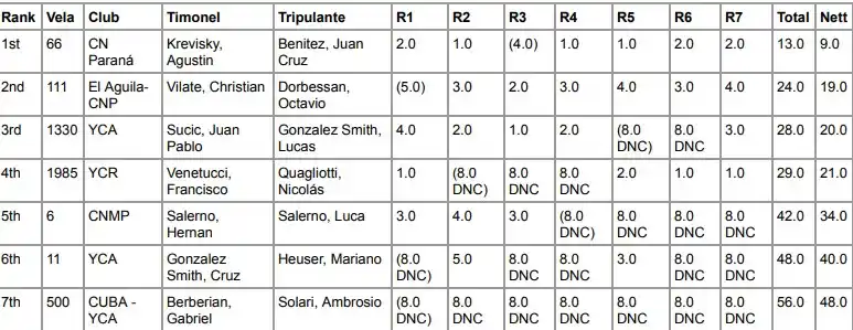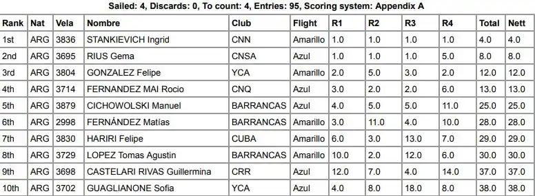Bajo estas condiciones meteorológicas, los Optimist Principiantes pudieron completar las dos regatas programadas. Con familiares y amigos siempre presentes acompañando desde la escollera, aún en jornadas grises como esta, la gran figura fue Ingrid Stankievic. La representante del Club Náutico Necochea obtuvo dos primeros puestos y lidera el campeonato con puntaje ideal. Detrás de ella, a nada más que cuatro unidades se ubica la rosarina Gema Rius, mientras que cierra el podio Felipe González, del Yacht Club Argentino, quien finalizó tercero y segundo en las pruebas del día.