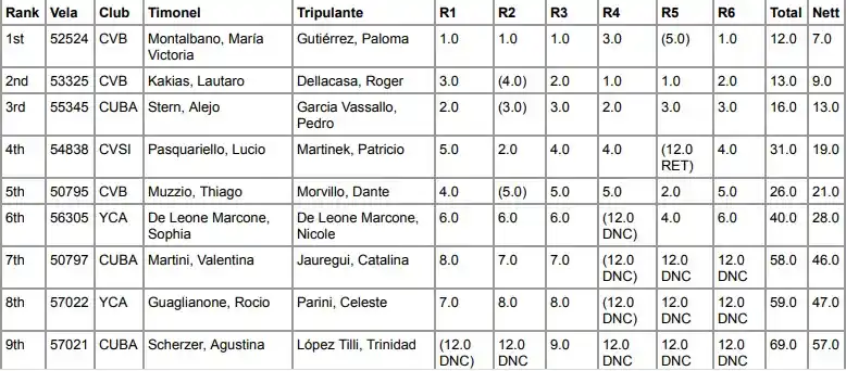 En 420, por su parte, los más destacados fueron Lautaro Kakias y Roger Dellacasa, del Club de Veleros Barlovento, con dos primeros y un segundo. De todos modos, se mantienen en la punta sus compañeras Maria Victoria Montalbano y Paloma Gutierrez, quienes resistieron con un tercero, un quinto y un primero. Para finalizar en cuanto a lo sucedido en el agua, en F18 Agustín Krevisky y Juan Cruz Benitez, del Club Náutico Paraná, se alejaron en la punta, que estaba por demás comprimida. Con un primero y dos segundos puestos aventajan por exactamente diez puntos a sus más inmediatos perseguidores. También hay que destacar a los rosarinos Venetucci y Quagliotti, los mejores del día (1°, 1° y 2°).