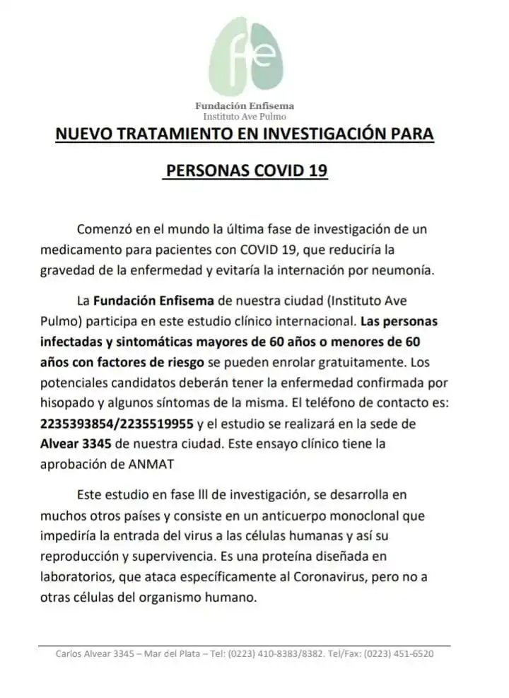 La Fundación Enfisema de nuestra ciudad (Instituto Ave Pulmo) participa en este estudio clínico internacional. Las personas infectadas y sintomáticas mayores de 60 años o menores de 60 años con factores de riesgo se pueden enrolar gratuitamente. Los potenciales candidatos deberán tener la enfermedad confirmada por hisopado y algunos síntomas de la misma.