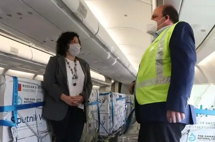 La ministra de Salud, Carla Vizzotti, y el presidente de Aerolíneas, Pablo Ceriani, con el último lote de Sputnik V llegado al país.