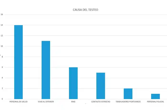 En cuanto a las causas que llevaron a hisopar a los 39 pacientes registrados en el Partido de General Pueyrredon, 15 corresponden a personal de salud (de los cuales 2 también catalogaban como contactos estrechos de casos positivos), 11 por haber viajado al exterior, 6 por infecciones respiratorias agudas graves, 4 por contacto estrecho con contagiado, 2 son trabajadores portuarios y 1 es personal policial. Es decir, muchos de ellos nunca presentaron síntomas de la enfermedad o tuvieron síntomas leves y fueron testeados por la labor que desempeñan y ante el riesgo que implicaría un caso positivo sin aislamiento en ciertos ámbitos como hospitales, clínicas, comisarías o barcos.