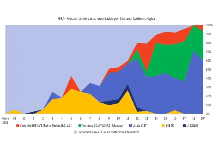 Según el último informe de Proyecto PAIS sobre la situación epidemiológica hasta el 19 de mayo de 2021. Aún no se detectó la variante Beta (Sudáfrica) ni Delta (India); mientras que sugieren considerar al linaje C.37 (variante Andina) como variante de interés regional, debido al incremento sostenido de su frecuencia de detección en el AMBA.