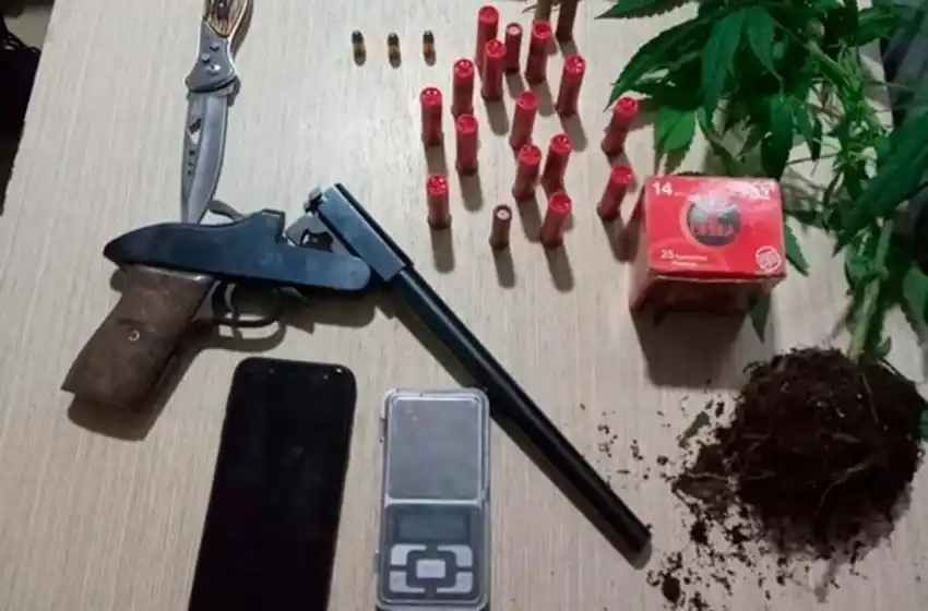Al hacer una revisión del domicilio, además de aprehender al hombre, encontraron un arma de fuego marca PVT calibre 14, 14 cartuchos calibre 14 y 3 cartuchos calibre 32, dos calibre 36 , dos calibre 12, una navaja, una balanza y una plata de cannabis Sativa.