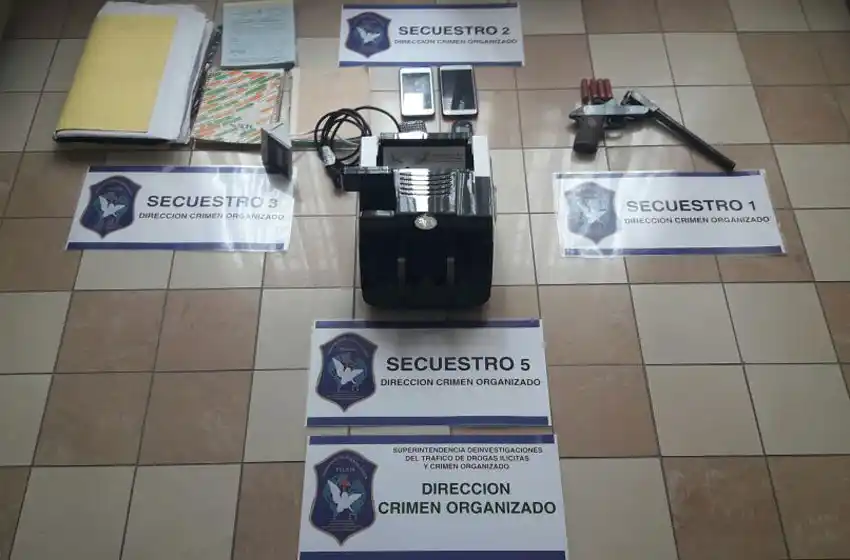 En los allanamientos, donde participaron también efectivos de Policía Científica y móviles de Traslado y Custodia de Detenidos, se secuestraron documentación referida a la causa, máquina de contar billetes, dos armas de fuego, celulares, varias computadoras.