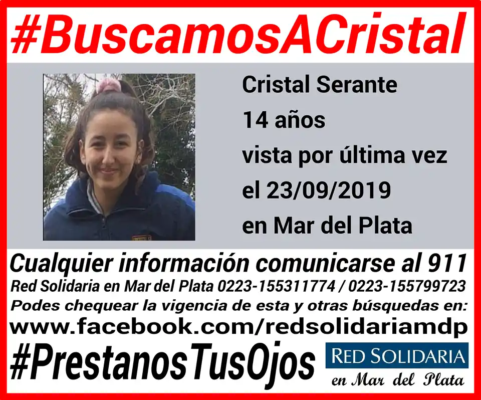 Se trata de Cristal Serante, que vestía jean negro con roturas, campera celeste con capucha y zapatilals verde agua. Circulaba en una bicicleta playera roja y blanca.