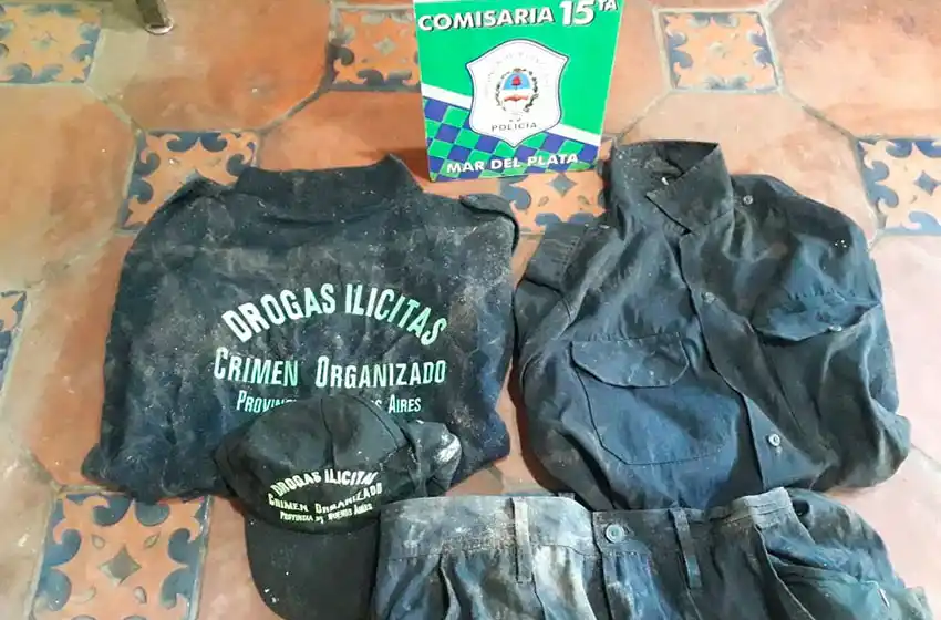 El segundo objetivo está ubicado al lado de la vivienda anterior. Allí se aprehendió a otro sujeto de 25 años, que tenía en su poder indumentaria policial. Tenía una gorra con la inscripción "Drogas ilícitas" de la policía de la Provincia de Buenos Aires, una chomba con las mismas inscripciones y un uniforme.