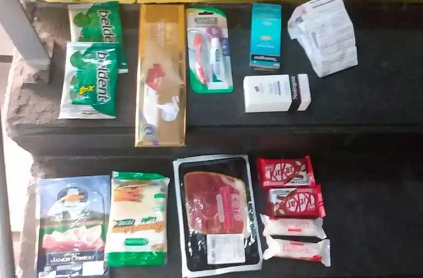 La mujer tenía ocultos dos paquetes de chicles, una barra grande de chocolate, un kit portátil de higiene bucal, una crema para manos, jamón y queso en fetas envasados al vacío, dos paquetes de bombones, un gel hidratante facial y otros chocolates.