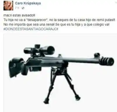 "Macri estás avisado!! Tu hija no va a "desaparecer", no la saques de tu casa hijo de remil putas!! No me importa que sea una nena! Se que es tu hija y a que colegio va #DONDEESTASANTIAGOCARAJO", fue el mensaje que había posteado en el Facebook del mandatario, la mujer junto a la foto de un fusil.