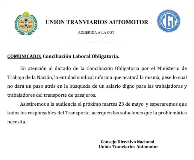 En ese sentido, desde la Unión Tranviarios Automotor expresaron: "En atención al dictado de la Conciliación Obligatoria por el Ministerio de Trabajo de la Nación, la entidad sindical informa que acatará la misma, pese a que no dará un paso atrás en la búsqueda de un salario digno para las trabajadores del transporte de pasajeros".
