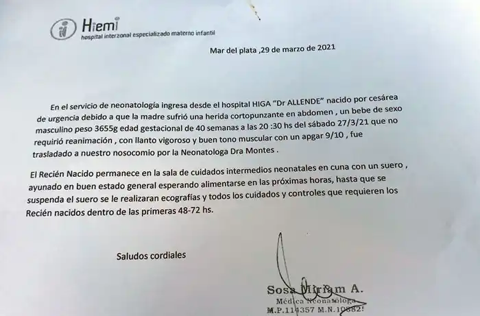 "En el servicio de neonatología ingresa desde el hospital HIGA nacido por cesárea de urgencia debido a que la madre sufrió una herida cortopunzante en abdomen, un bebe de sexo masculino peso 3655g edad gestacional de 40 semanas a las 20:30 hs del sábado 27/3/21 que no requirió reanimación, con llanto vigoroso y buen tono muscular", detalló el inicio del parte.