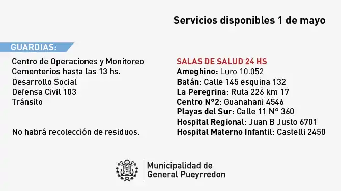 Por otra parte, las salas de Salud que atenderán las 24 horas serán las de Ameghino (Luro 10.052), Batán (Calle 145 esquina 132), Centro N°2 (Guanahani 4546) y Playas del Sur (Calle 11 N° 360). También funcionarán el Hospital Regional (Juan B. Justo 6701) y Hospital Materno Infantil (Castelli 2450) como centros alternativos.