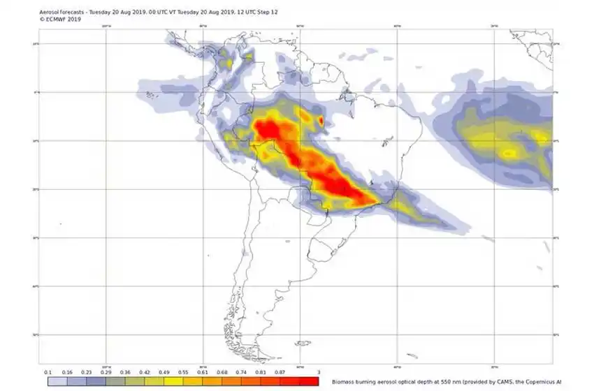 Copernicus, el programa de Observación de la Tierra de la Unión Europea, publicó un mapa que muestra el humo de los incendios que llegan hasta la costa atlántica de Brasil.
