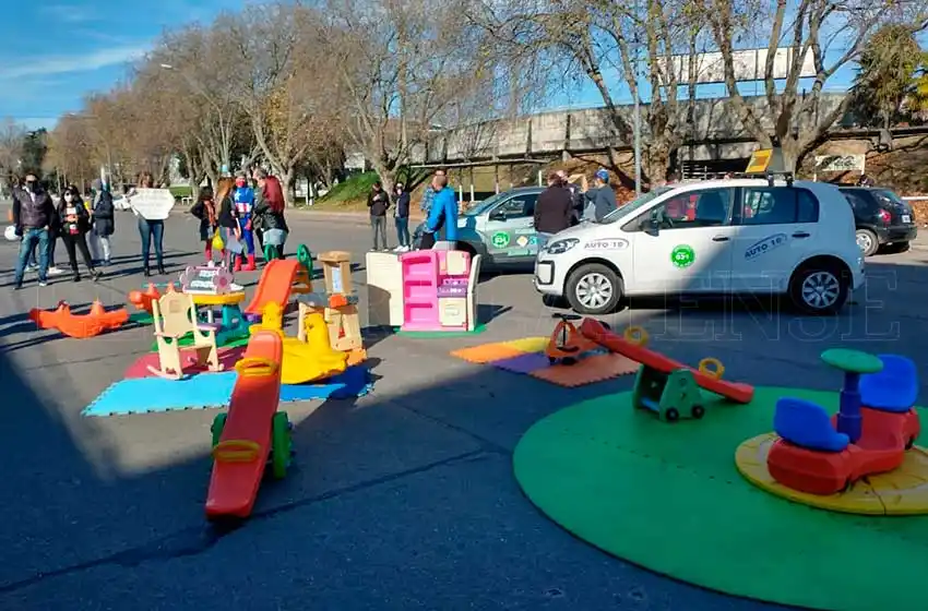 A la entrada del Centro de Operaciones y Monitoreo llevaron juegos, alfombras y toboganes para hacer más visible su pedido para volver a la actividad.
