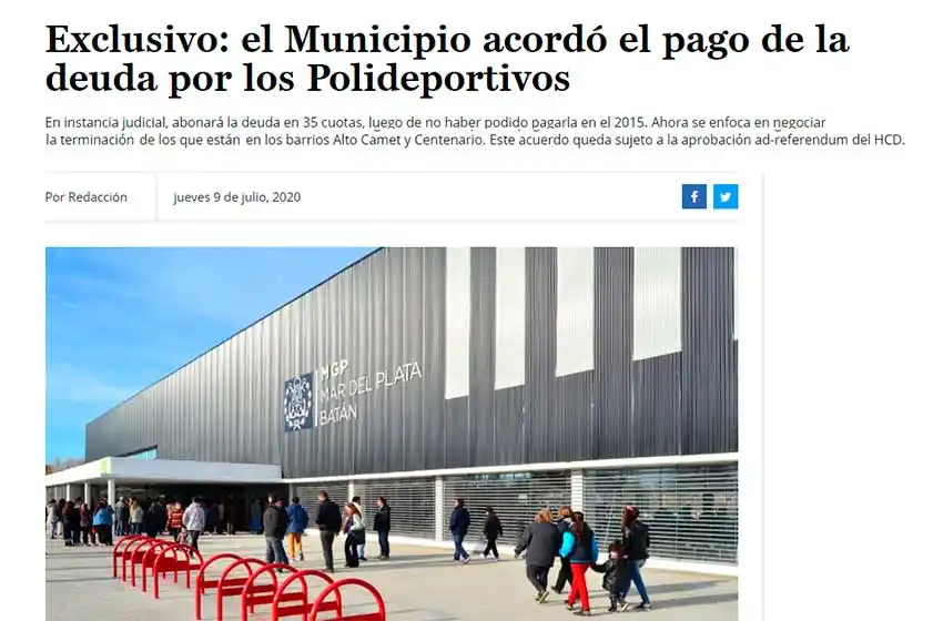 El intendente Guillermo Montenegro elevó el pasado 13 de julio a consideración del Concejo Deliberante un proyecto de ordenanza que busca convalidar el acuerdo judicial para cancelar la deuda con la empresa Centro de Construcciones SA, que fue la constructora de los Polideportivos y Natatorios de los Barrios Colinas de Peralta Ramos, Libertad, Las Heras, Centenario y Parque Camet.