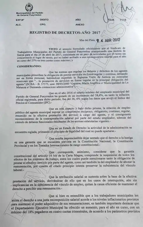 El Secretario de Gobierno, Alejandro Vicente, también fue consultado por El Marplatense y no puso en duda la continuidad del decreto. "Lógicamente que vamos a mantenerlo. Hasta ahora no ha sido motivo de negociación", afirmó, y justificó: "Pero nosotros no estamos negociando un decreto, sino la recomposición salarial".:format(webp):quality(40)/https://elmarplatensecdn.eleco.com.ar/media/2017/05/decreto-1.jpg)