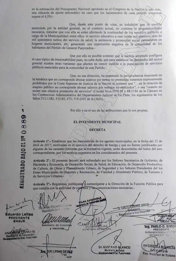 Tal como había anunciado en plena medida de fuerza, a través del Decreto 1118, que está respaldado con la firma de todos los integrantes del gabinete local, Arroyo resolvió que la inasistencias a los lugares de trabajo de los agentes comunales "serán descontadas del haber del mes correspondiente".