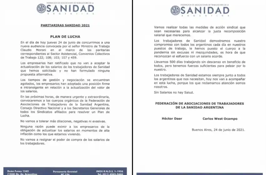 Por un lado, la Federación de Asociaciones de Trabajadores de la Sanidad Argentina (FATSA), cuyo Consejo Directivo esta liderado por Héctor Daer y Carlos West Ocampo, convocó a "un paro nacional de actividades de cuatro horas por turno los días jueves 1 y viernes 2 de julio, ante el fracaso de las negociaciones paritarias".
