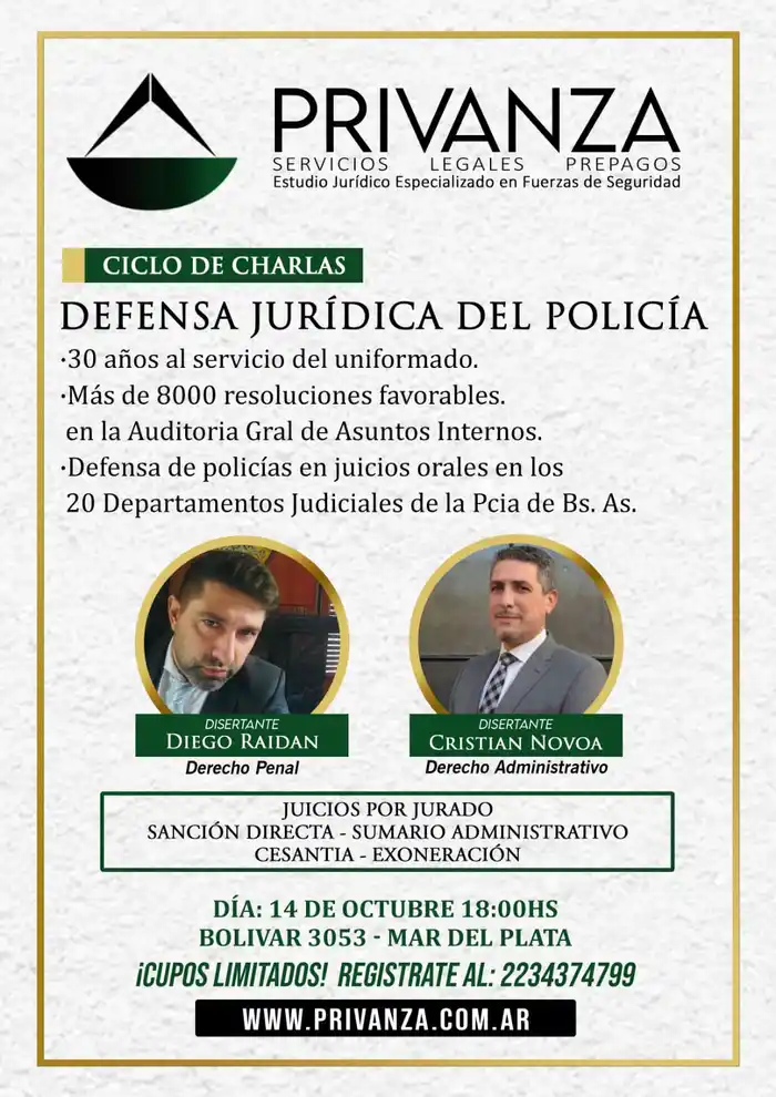 Con una trayectoria de 30 años en la defensa de los trabajadores uniformados, el estudio jurídico Privanza llega a Mar del Plata, dando el puntapié inicial con una disertación que se realizará este jueves 14 de octubre a las 18, en Bolívar 3053, la cual estará a cargo de Diego Raidán, especialista en Derecho Penal y Cristian Novoa, especialista en Derecho Administrativo.