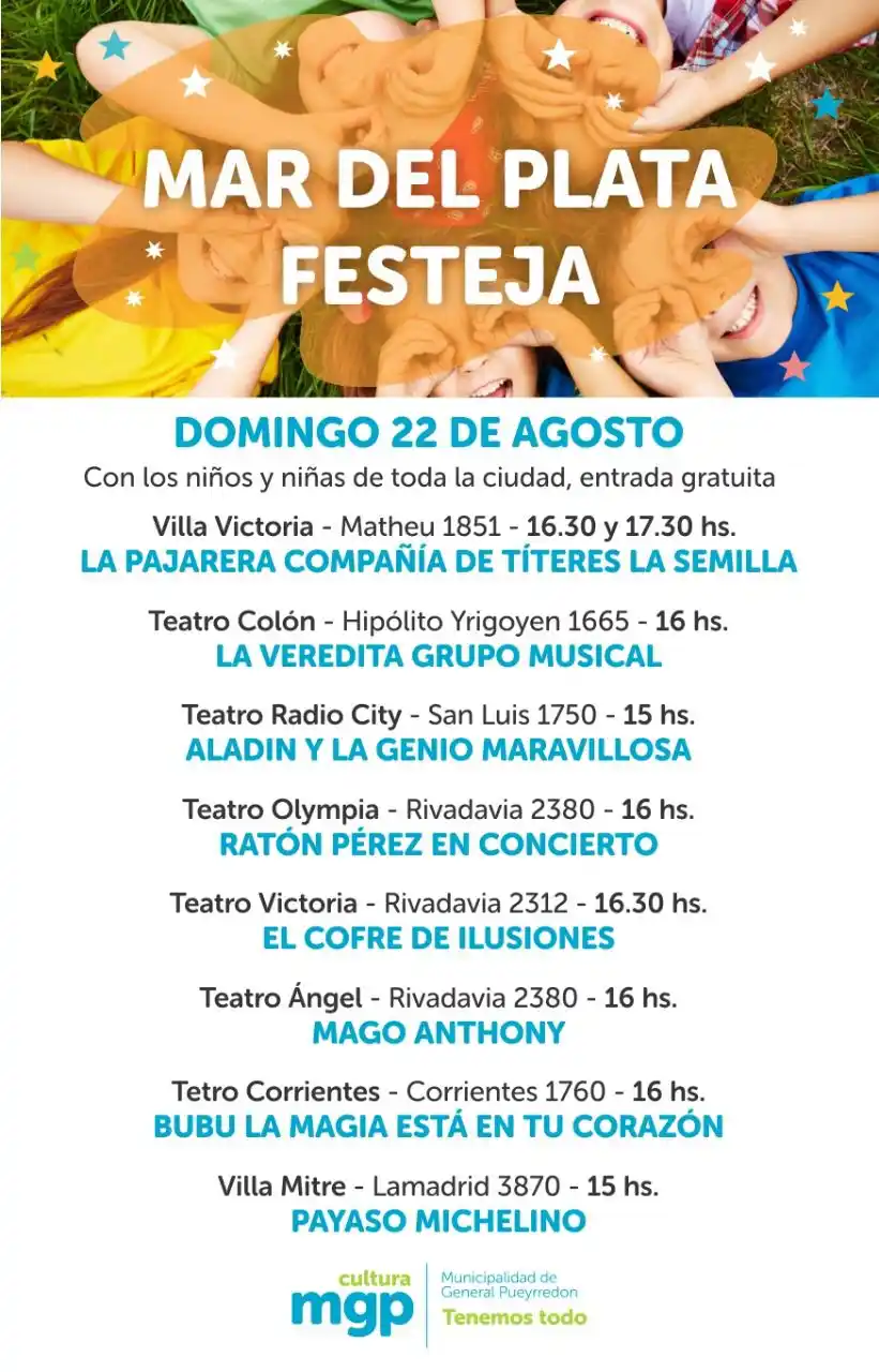 En el marco de "Mar del Plata Festeja", una propuesta de la Secretaría de Cultura para celebrar el Mes de las Infancias, este domingo se desarrollará una jornada especial con espectáculos libres y gratuitos para niños y niñas en distintos escenarios.